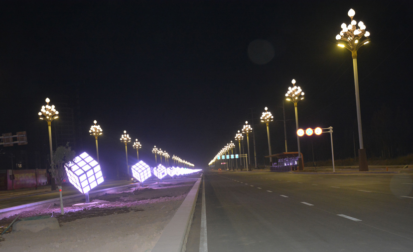 2015年6月,華體照明承接了新疆哈密市區主要道路路燈改造工程,該工程歷時4個月時間,于2015年10月結束。荔枝中華燈,即“花燈”,指的是多頭,植物造型的燈桿。該款燈在傳統中華燈的基礎上進行了改良,保留其神韻,加入荔枝的元素,巧妙地將荔枝的形態與花燈完美結合。為表現哈密為“哈密瓜”之鄉的地域文化,此次燈型設計為四層荔枝的裝飾光源,從遠處看其外形輪廓酷似哈密瓜,特別是夜間亮燈后,更是形態逼真,不僅為夜間市民的出行提供便利,更加提升哈密的城市形象。