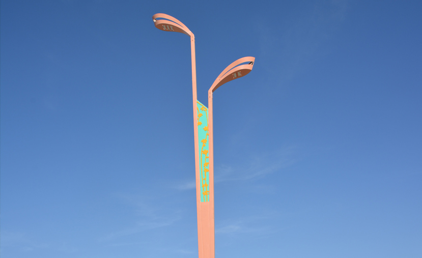 夜幕降臨,魔方燈陣通過預設的光效變換模式,開始了絢麗的表演秀,時而忽快,時而忽慢;時而交相輝映,時而如夢如幻,為哈密的夜空增添絢麗的色彩,為當地市民呈現一場燈光的視覺盛宴。梧桐絮語,燈高10m,運用玉蘭燈頭,輔之以鏤空的梧桐剪影,流暢的線條,V型的桿體,帶來強烈的視覺沖擊。該燈主照明光源采用LED,裝飾光源位于梧桐剪影的下方,每當夜幕降臨燈光開啟,婆娑的梧桐樹影便活潑生動的展示出來。