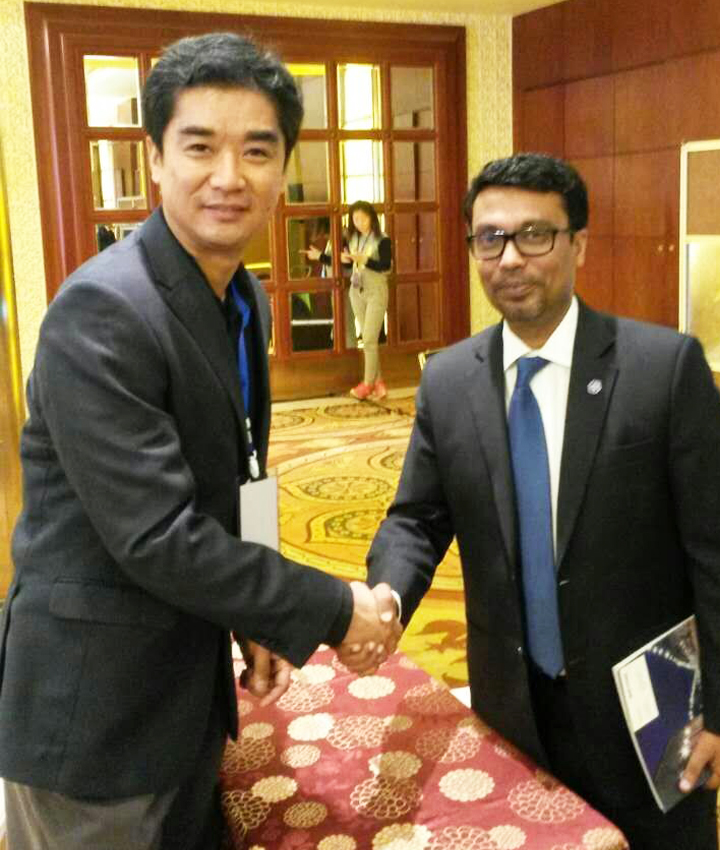華體照明首席技術官(CTO)王銘宇與尼泊爾商業及工業部主席PashupatiMurarka親切握手